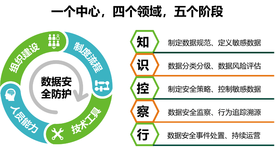 科学完善的数据安全建设体系就是以数据安全防护为中心,同时在组织建设、制度流程、技术工具和人员能力这四个领域开展建设工作,通过“知”、“识”、“控”、“察”、“行”五个阶段性步骤进行数据安全落地建设,最终可帮助数据使用方确立数据安全管理制度,全面了解数据资产安全状况,进而提升数据安全监测与防护措施。并通过优化改进与持续运营,建立持续自适应的数据安全防护体系。