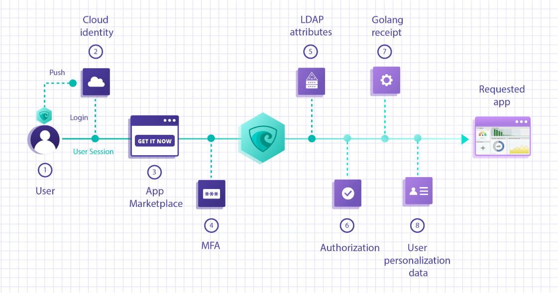 6. 数据被打包到用户会话的HTTP头中,以供应用程序使用,无需任何更改。同时,MFA检查从属性提供者、应用程序和其他身份系统收集的额外用户数据(可选)。
