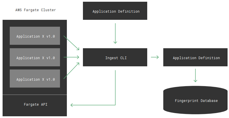 指纹录入是Open Raven监督训练的主要方法。基于云的采集流程如下图所示。该流程利用Amazon Web Service (AWS)的无服务计算引擎Fargate与容器运行时Docker,允许Open Raven快速启动应用基础设施进行指纹采集,并在指纹录入完毕时缩小集群规模。