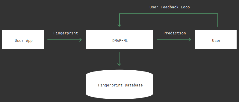 虽然Open Raven的初始数据集和模型基于指纹录入,但Open Raven的工作流设计允许(并鼓励)用户反馈和细化预测结果,“反馈-改进”流程如下图所示。当应用程序预测结果显示给用户时,若预测结果不准确,用户可以根据自己的实际情况否定预测结果,并如实反馈给DMAP-ML。该反馈结果将实时集成到DMAP-ML中的Open Raven DMAP预测引擎中,从而使得DMAP利用新获得的知识提高将来的预测准确率。
