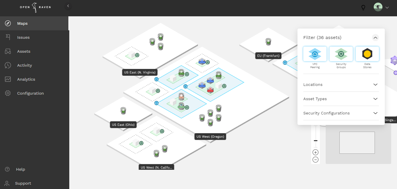 Open Raven通过全局3D视图用户显示每个AWS账户和资产情况,不同资产类型有不同的地图图标表示;单击单个资产的图标以查看其属性;Open Raven按其物理位置对资产进行分组。可视化窗口边缘部分显示连接到基础设施的 IP 地址。