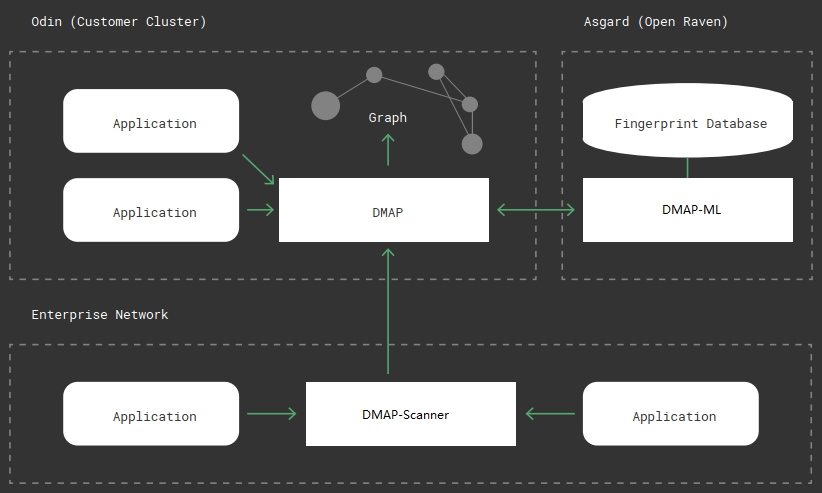 DMAP是一个以云为中心的分布式体系结构。DMAP-ML运行在Open Raven管理集群(Asgard)中,而DMAP运行在客户Open Raven 集群(Odin)中。对于希望映射其企业本地网络(非云部署)的用户,DMAP-Scanner在得到授权后,在本地运行并将处理结果反馈给DMAP。