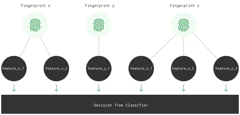 当建立决策树模型时,指纹被转换为机器学习特征,然后输入到训练模型中。每个指纹都会产生一个或多个机器学习特征,如下图所示。