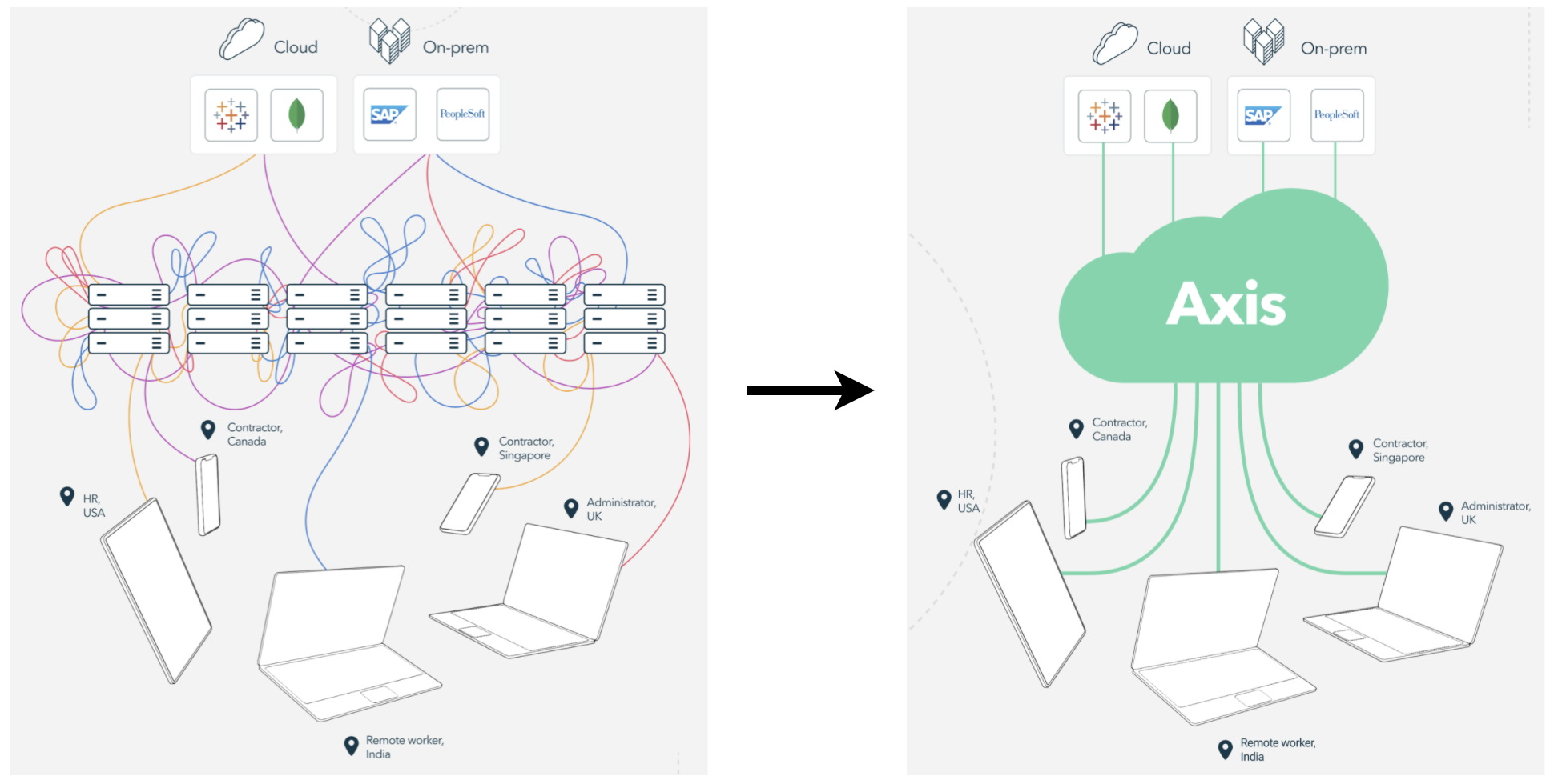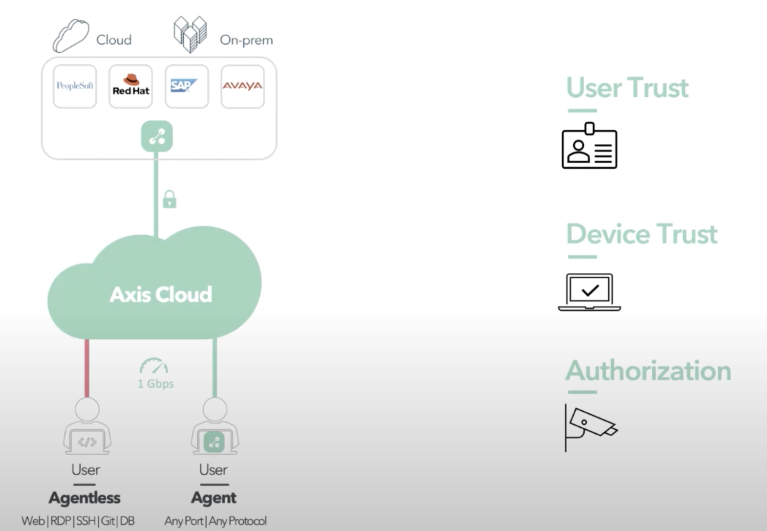 上图左侧描绘的是传统VPN的使用场景,各种终端通过VPN接入企业的云和网络;右侧则描绘了终端通过Axis Cloud接入企业的云和网络。