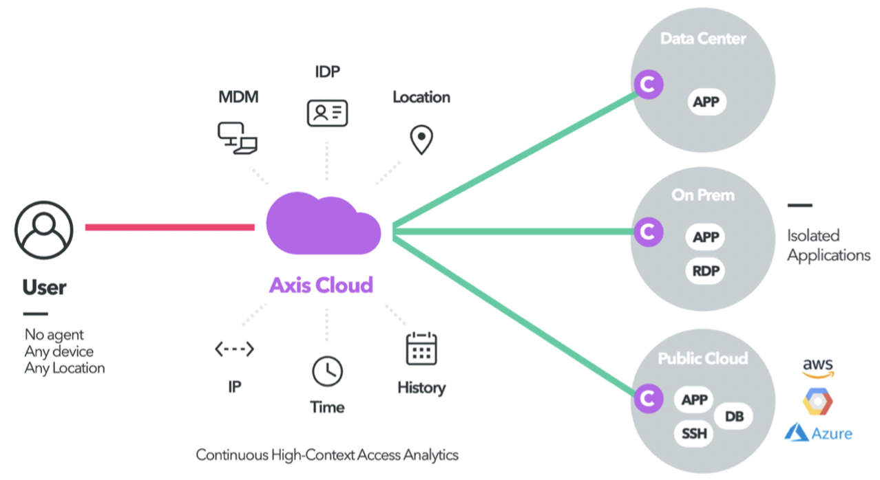 无论员工在哪,Axis Application Access Cloud都能向其提供企业应用和资源的访问服务。员工只需几分钟即可完成配置,不需要修改终端侧的网络或安装客户端软件。企业可以通过中心化的云控制台管理所有的用户、应用和策略。与网络层的解决方案不同,Axis提供完全的可观察能力和应用层级别的细粒度用户活动控制。Axis通过将应用与用户、终端和互联网隔离,避免应用遭受攻击。