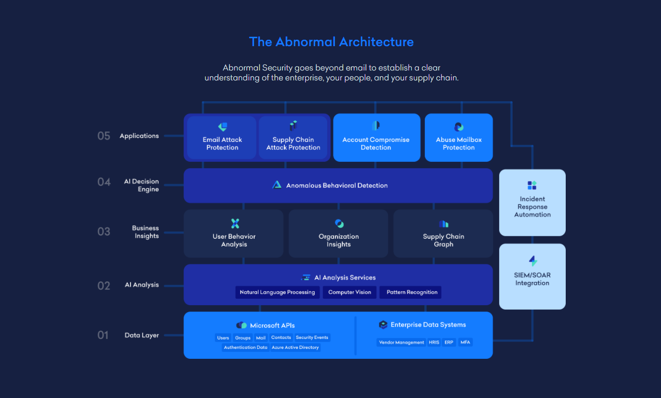 Abnormal Security提出的Abnormal架构包含5层结构,具体包括负责收集数据整合数据的Data Layer,利用AI技术进行数据分析的AI Analysis Layer,利用行为分析、关系分析进行智能融合的Business Insights Layer,利用机器学习模型进行AI决策的AI Decision Engine,以及最终落地的产品Application。