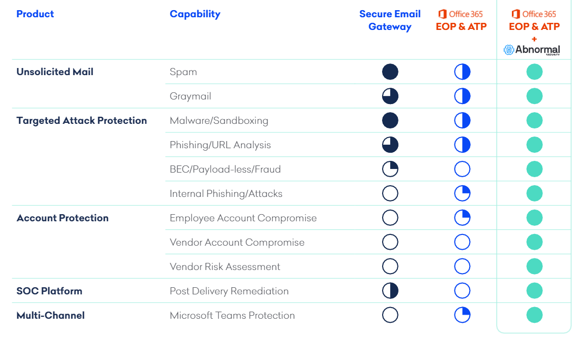 Microsoft Office365目前是应用最广泛的邮箱SaaS服务,其邮件安全防护主要包括Exchange Online Protection(EOP)和Advanced Threat Protection(ATP),EOP主要作为邮箱防护的基础功能为用户过滤垃圾邮件,检测恶意软件等;ATP主要作为Office365的升级服务可以提供自动响应和攻击模拟的防护能力,避免公司组织收到复杂的邮件攻击,例如网络钓鱼以及0day恶意软件等。但是由于在企业中Office365无法结合部门和跨职能之间的用户关系以及组织关系,因此无法对有针对性的邮件攻击例如内网钓鱼、网络欺诈、企业账户安全等更强的ATP攻击进行有效防护;另一种传统的邮件防护方式是SEG邮件安全网关,SEG邮件安全网关和Office365相比存在一定的安全防护特性的重复,例如垃圾邮件检测,恶意软件检测;此外SEG邮件安全网关也无法覆盖企业员工内部系统,例如ERP系统、Vendor管理系统,和Office365的集成对SEG来说目前还不支持。Abnormal Security孵化的产品不仅能够和Office365等邮件SaaS服务无缝集成,而且能够利用AI技术解决企业邮件攻击的检测和防护,不仅包括APT攻击、内部钓鱼、网络欺诈等。而且通过将ERP、Vendor管理系统的信息集成到产品中,可以支持对企业用户全方位的账户保护。对比Office365和SEG,Abnormal Security产品特点如下图所示: