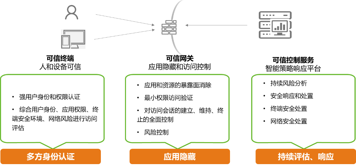 零信任另一个关键的能力是对访问链路持续评估、以及对评估结构能够动态调整策略。在用户对应用的访问过程中从最初的认证到最终访问注销,伴随着持续的风险和信任的评估,根据不同的评估结果会进行动态的访问控制。通过多方感知到安全数据的汇聚,零信任相关组件会将汇聚的数据结合资产组网、防护关系、历史行为数据、安全事件等等,多维度对用户、终端、网络访问行为进行风险和信任分析。当访问主体的信任级别与客体安全分析后的结果是平衡状态的时候,才能保持应用访问使用。否则会进行阻断或者强行要求二次认证等决策。