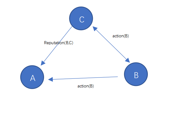 维基百科(Wikipedia)上对信任(Trust)的定义为[1]:一方(信任方)在未来依赖另一方(被信任方)行动的意愿。假设给定三方A、B、C,三者之间都有交互,如下图所示。