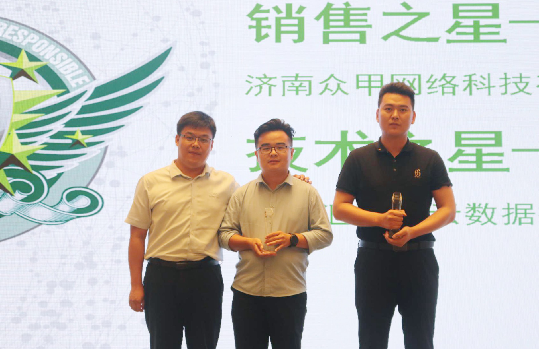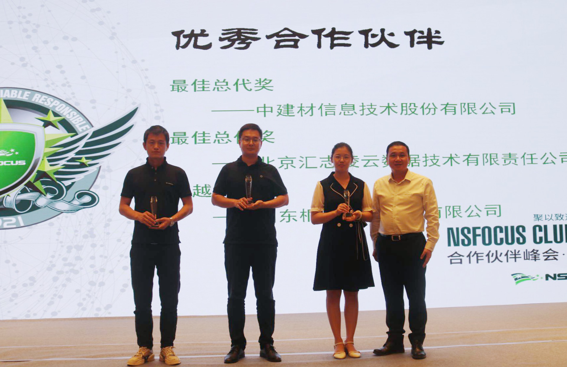 绿盟科技为中建材信息技术股份有限公司、北京汇志凌云数据技术有限责任公司、山东桐久信息技术有限公司、济南众甲网络科技有限公司、济南华众世纪信息技术有限公司、山东茂琪信息科技有限公司、山东律创电子工程有限公司等优秀合作伙伴现场颁奖。济南众甲网络科技有限公司马梓铭、北京汇志凌云数据技术有限责任公司何顺分别获得“销售之星”和“技术之星”荣誉称号。