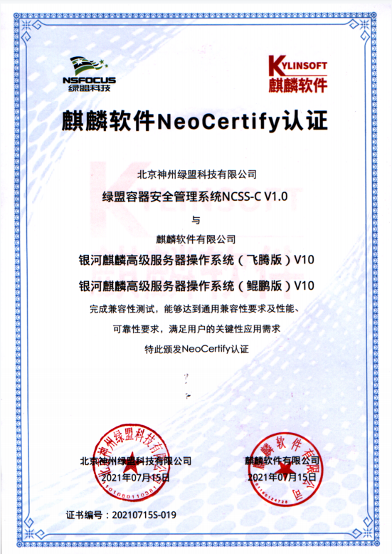 2021年7月15日,绿盟科技与麒麟软件有限公司共同完成绿盟容器安全管理系统(NSFOCUS Cloud Security System-Container,简称NCSS-C)与银河麒麟高级服务器操作系统(飞腾版)V10、银河麒麟高级服务器操作系统(鲲鹏版)V10产品兼容性互认证测试。测试结果显示,绿盟容器安全管理系统在银河麒麟操作系统下功能兼容性良好、运行稳定、性能表现优异。这标志着绿盟科技能够基于飞腾、鲲鹏系列CPU,银河麒麟操作系统为客户提供信创容器云安全解决方案。