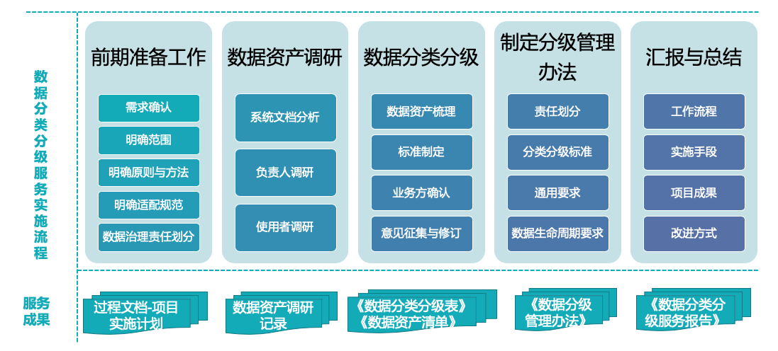 通常数据分类分级服务实施分为五个阶段,分别为:前期准备阶段、数据资产调研、数据分类分级、制定分级管理办法以及汇报与总结阶段。