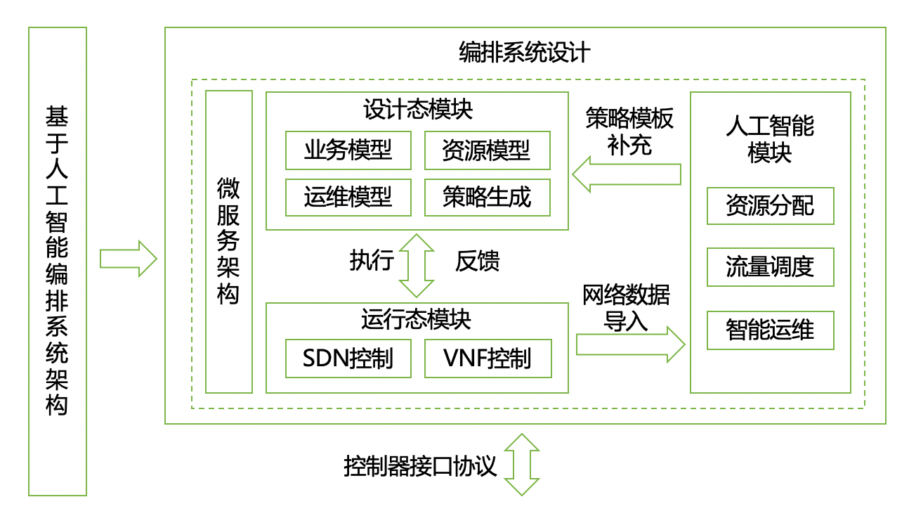 网络靶场主要使用虚拟化和网络编排等技术来构建各类业务仿真环境。其中网络编排通常分为高层业务编排和底层网络资源编排。业务编排和网络资源编排相互依赖,形成一套闭环的网络编排系统,实现自动化、定制化环境构建。已经有很多研究表明人工智能在SDN管理(网络资源)、NFV编排(业务)等方面都表现出优异的性能。通过人工智能技术和网络编排的结合,可构建人工智能的网络编排架构,实现“自动化”到“智能化”的转变,达到高效、稳定、快速的目标网络环境仿真。