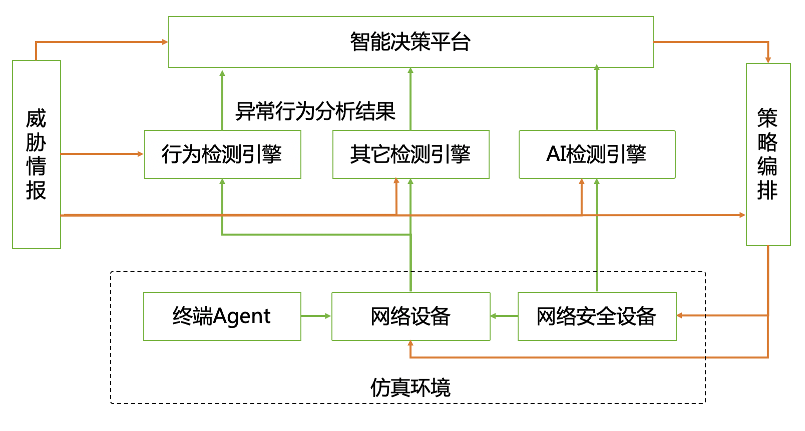 网络靶场的目标之一就是复现企业网络环境,支持各角色用户在此环境上进行攻防实战,进而对制定企业的安全防御体系或进行优化。而通过与人工智能技术的结合可搭建智能决策平台,在资源有限的情况下,针对遇到的安全问题,输出处置的行动方案,再转成脚本化的策略,下发到防护设备上。智能决策平台构建通用性的AI协同决策支持系统框架,支持安全专家或其他系统的信息输入,并根据专家系系统或其他系统的输入的变化进行决策的调准和优化,提供有效人机协同能力,实现闭环决策。