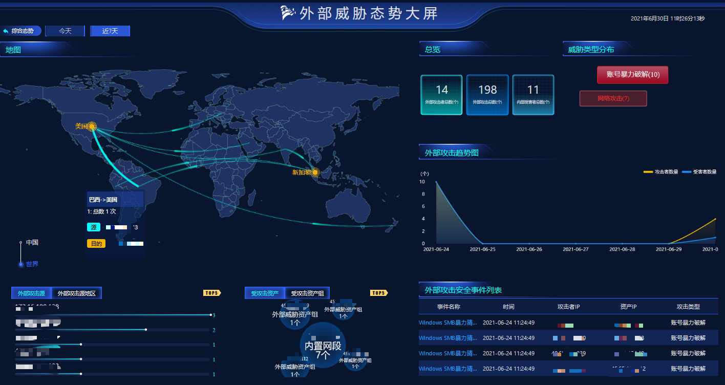 外部威胁是从外部对内部的外部攻击视角展示威胁事件,能及时发现攻击来自哪里、哪些资产常被攻击、常见哪些攻击类型。