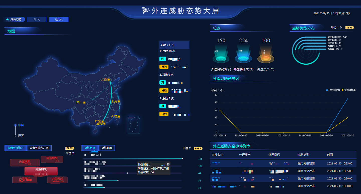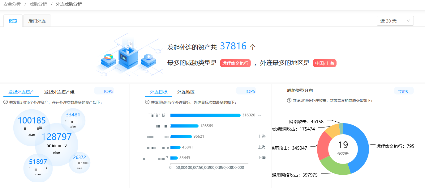 外连威胁是从内部对外部的外连泄露视角展示威胁事件,能及时发现哪些资产发起外连、哪些资产被攻陷在后门外连。