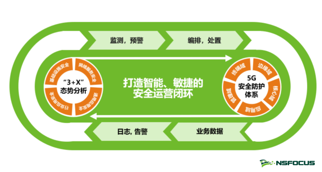 绿盟科技5G安全防护体系充分考虑传统防护理念和创新安全理念的深度融合。在深入理解5G安全需求的基础上,结合多年的网络安全技术和经验积累,创新性地提出了“以集中化态势分析为核心、以全方位安全防护体系建设为根本”的“3+X”5G安全整体防护思路,着力打造智能、敏捷的5G安全运营闭环。总体安全体系架构如下图所示。