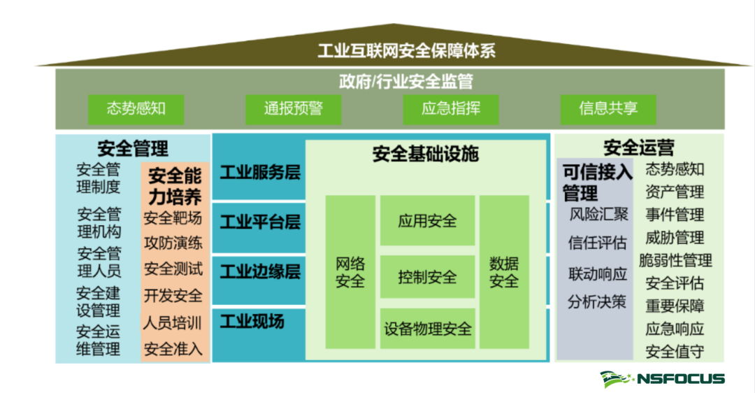 绿盟科技工业互联网安全防护体系,是由安全基础设施、安全运营、安全管理和政府/行业安全监管四个组成部分构建的一体化动态综合防御体系。总体安全体系架构如下图所示。