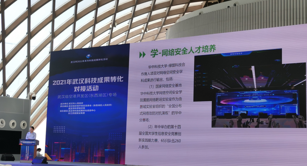 9月16日,2021年武汉科技成果转化对接活动·武汉临空港开发区(东西湖区)专场在武汉国家网络安全人才与创新基地展示中心举办。中国工程院院士姜德生,中国科学院院士徐红星,武汉市委副书记、市长程用文,市委常委、市委秘书长龙良文,市委常委、市政府党组副书记、副市长彭浩等领导,20余所高校负责人及企业代表等共同参与本次活动。绿盟科技集团南区总经理袁强、武汉办事处首席代表张敬民出席,并受邀参与华中科技大学网络空间安全学院网络靶场实验室项目科技成果转化签约和路演活动。