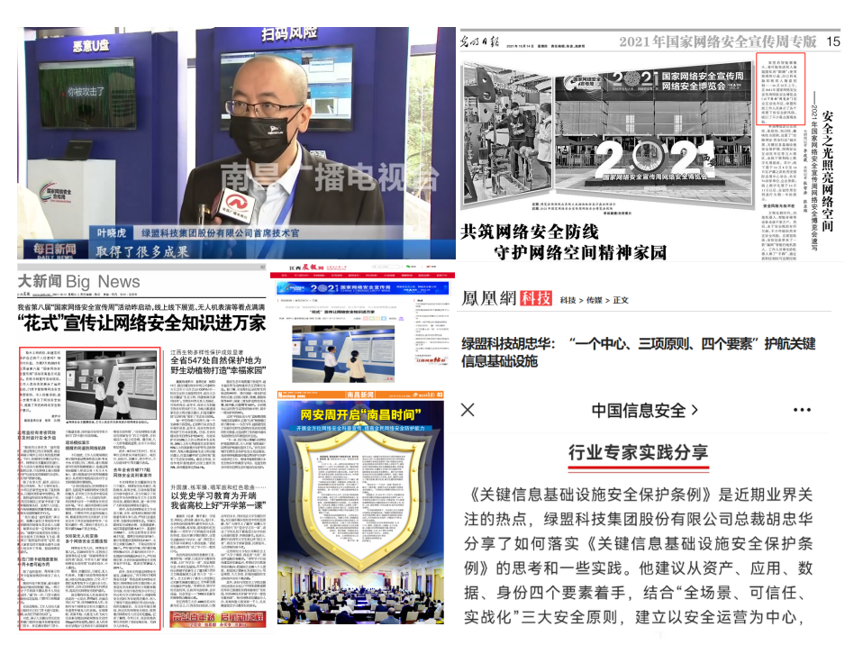 光明日报、中国新闻网、凤凰网、腾讯网、江西电视台、江西晚报、新法制报、宁波电视台、信息安全与通信保密、中国信息安全、信息技术与网络安全等媒体对网安周期间绿盟科技的活动进行了多角度、全方位报道。