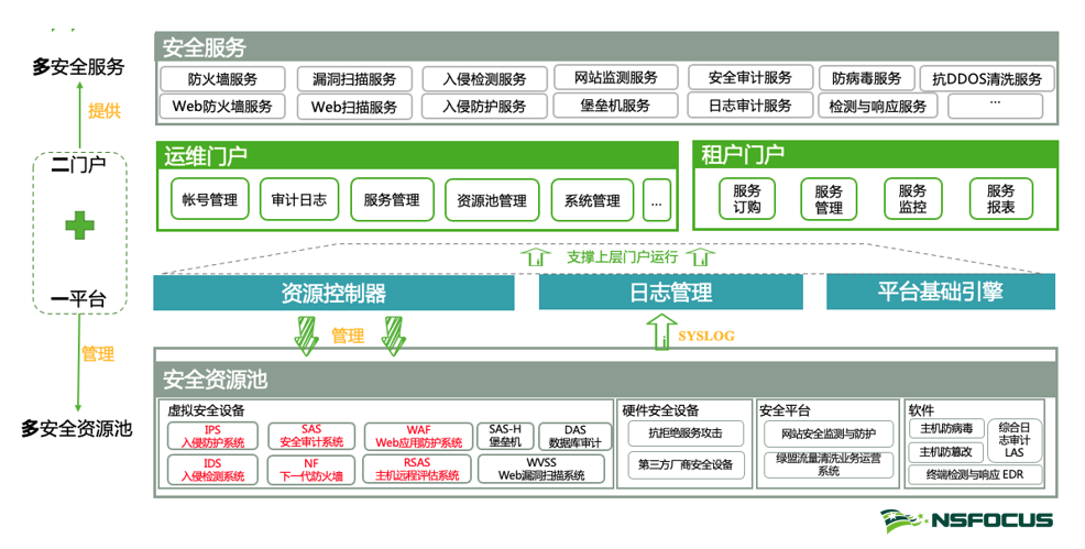 绿盟科技结合医疗机构的信息化建设特点,基于SDS 技术思想,将虚拟化安全能力资源池进行统一编排、调度和管理,通过统一的运维门户对安全资源池的资源进行管理、分配、服务编排,从而实现对综合能源站部署的安全资源进行统一的管理。同时,依靠运维门户可自主控制安全服务的开通,实现对虚拟化安全设备全生命周期的管理,控制启动、关闭、重启和删除等操作。通过部署安全资源池,利用通用X86服务器,为各信息系统提供专业、灵活和丰富的安全防护能力。通过设备资源池化可对上层提供多种安全能力,如IPS资源池提供入侵防护的能力,WAF资源池提供 Web 防护的能力,防火墙资源池提供访问控制的能力。