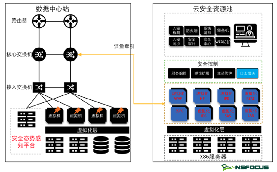 这么做的优点是,根据云上信息系统的安全需求,从资源池中找到相应资源,而不用关心物理安全设备实际部署在哪里,也不需要考虑网络如何划分。资源池控制器还可以对接云内网络设备,实现引流的全自动化流程。当租户下发了防护策略后把网络内流量自动按需牵引到安全资源池内做检测和防护,为医疗机构云数据中心构建全面的纵深安全防护体系,实现对云数据中心的全面防护。
