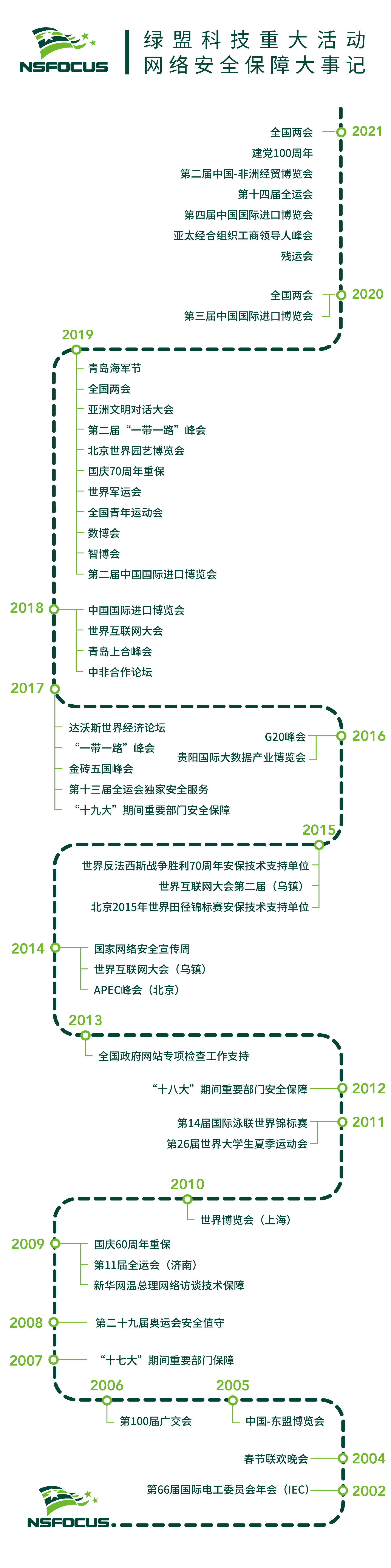 作为巨人背后的专家,基于成熟的重大活动保障体系,依托专业的保障团队,整合绿盟科技威胁情报运营能力、安全预警和处置能力、产品平台支撑保障能力以及应急响应和安全研究能力,绿盟科技先后为上合峰会、世博会、APEC峰会、世界互联网大会等重大活动提供网络安全保障技术支持,以实际行动践行使命,为重大活动期间的网络安全保驾护航。