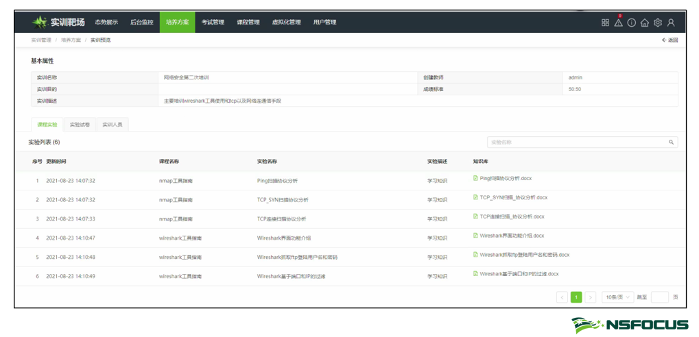绿盟科技网络空间安全仿真平台,可根据高校实际教学需求,设置教员、学员和管理员三类角色。老师作为教员可利用平台根据人才培养要求定制培养方案并下发给学生,培养方案包含了课程内容、随堂试卷及实训任务,学员登陆平台选择实训任务即可开始实验。老师通过下发考试任务对学员开展阶段性考核,以掌握学员的整体学习状况。