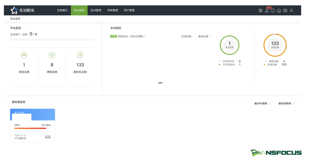 拥有最高权限的管理员既可以查看正在进行的实训课程、在线用户、实训进度、课程进展、学生排名等实时信息,也可查看服务器、宿主机及实训资源的占用情况,方便管理员掌控实训进度的同时也能够根据设备运行情况进行资源调度。
