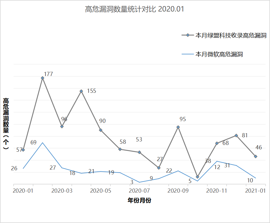 2021年01月绿盟科技安全漏洞库共收录375个漏洞, 其中高危漏洞46个,微软高危漏洞10个。