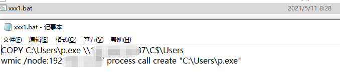 通过共享拷贝与wmic命令,将勒索病毒样本拷贝到目标主机并执行:
