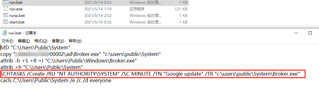 病毒本身并不具备系统驻留功能,不会读写被加密终端的任何启动项。但在一些案例中发现,部分攻击者通过批处理的方式新建定时计划任务来不断启动加密程序,以便达到感染新文件、新存储介质的目的。