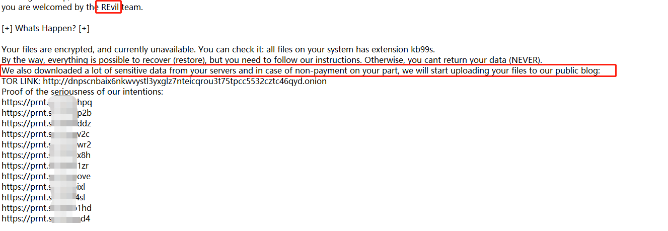 REvil家族在渗透的过程中除了投放勒索病毒,还会收集上传被攻击系统的文件。某案例中,勒索信提到“我们还从您的服务器下载了大量敏感数据,如果您不付款,我们将会把您的文件上传到我们的公共博客”。