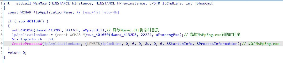会释放出一个exe和一个dll到临时目录,并启动进程MsMpEng.exe