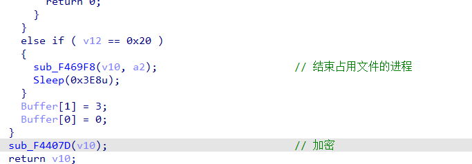 在加密的过程如果发现文件为目标感染文件,但被进程占用,病毒会调用terminateProcesss结束相关进程,再进行加密。