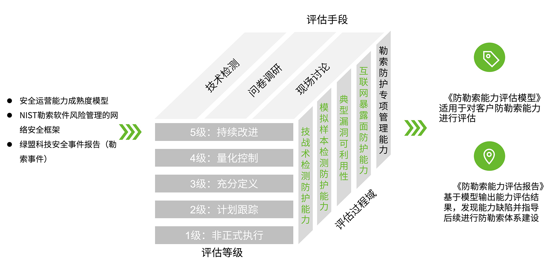 绿盟勒索演练及评估服务以自研的防护能力评估模型为基础,考虑攻击团伙可能的入侵路径,对路径上防御手段的有效性进行验证和评估,暴露安全问题并给出优化建议,主动的、有针对性的快速提升安全防护能力,以应对勒索等多种网络攻击。