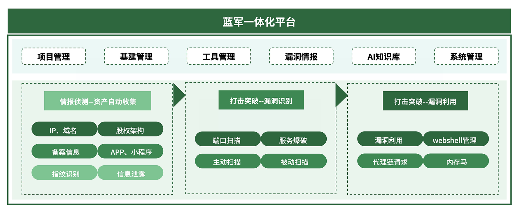 绿盟蓝军一体化平台深度融合绿盟丰富的攻防实战知识和经验,以高效协同作战为理念,以实战化攻防流程为基础,在后端安全研究团队长期的漏洞积累、免杀对抗经验的基础上,实现了自动化资产发现,自动化识别漏洞、一键漏洞打击利用等核心功能,有效提升边界突破效率,助力企业快速提升蓝军能力。蓝军一体化平台创新新的引入了AI技术,显著提高攻防决策的效率和准确性,推进攻防实战的高效和智能化。